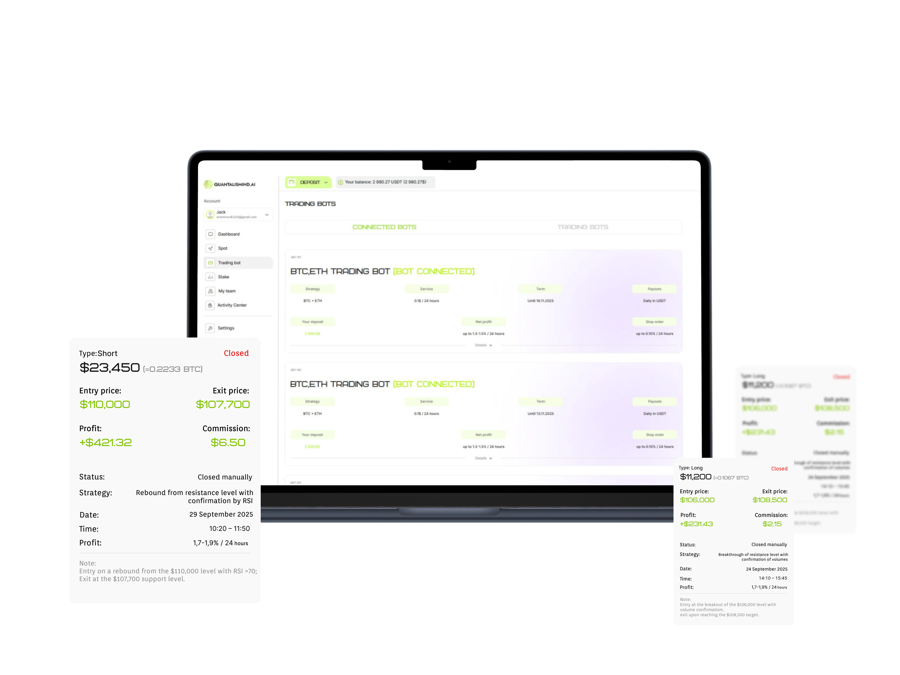 I’ve been using Quantalismind trading bots for over three and a half months now. My first deposit was $1,500, and later I connected another bot using my profits — already for over $2,000. Due to family circumstances, I withdrew $2,300, but a month later I came back and topped up my balance with $4,895. Now I’m working with this amount and withdraw my net profit whenever I want. It’s convenient that you don’t have to be a crypto expert — everything works automatically. Thank you, Quantalismind, for existing! I recommend it to everyone! I’m trying to grow my referral network too, but that will come later!
